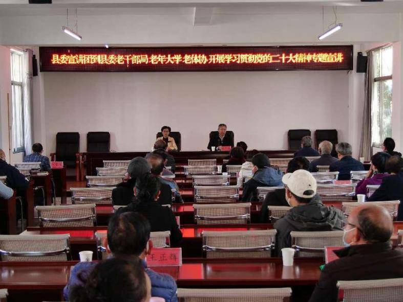 近日,禄劝县委书记张先宝到县委老干部局、老年大学、老体协开展学习贯彻党的二十大精神专题宣讲。县委常委、宣传部部长付应芝主持宣讲。全县副县级以上及科级离退休老干部代表、老年大学师生代表、老体协代表,县委老干部局全体干部职工共48人聆听了宣讲。